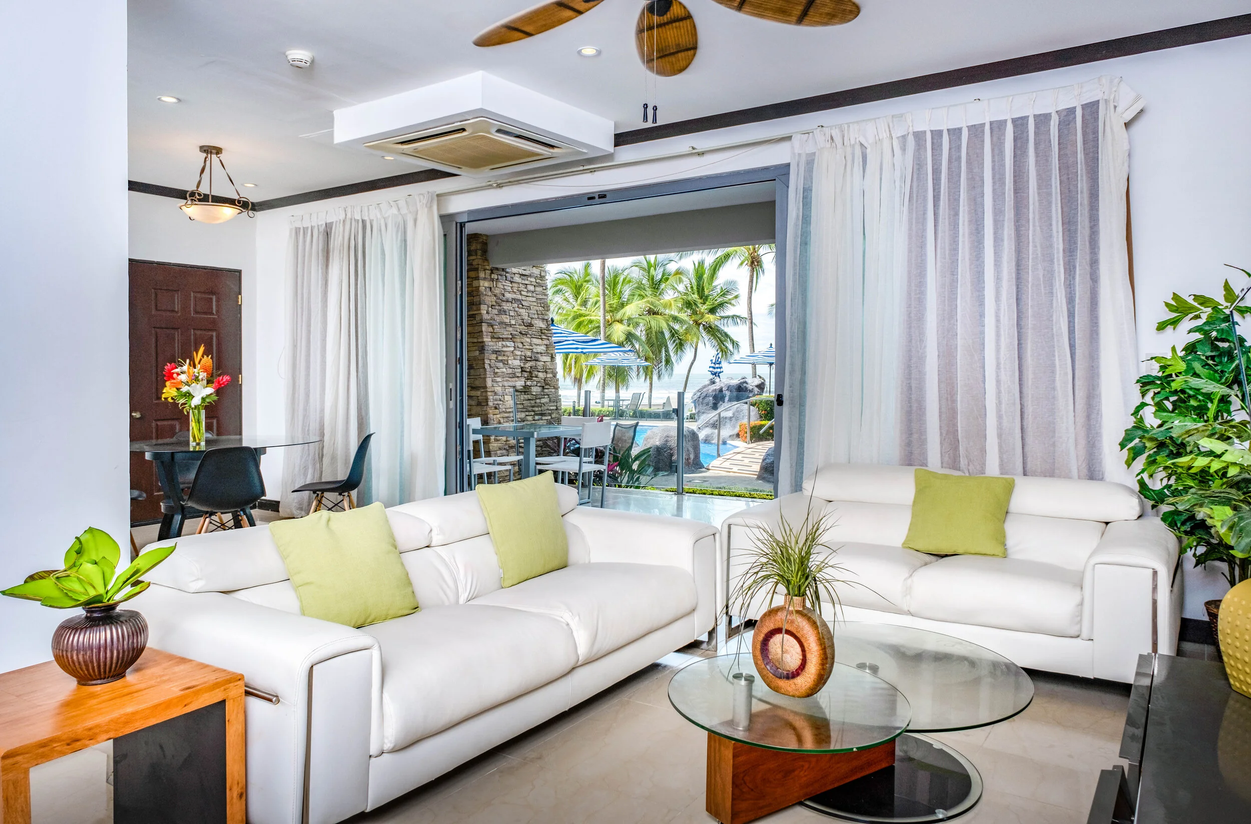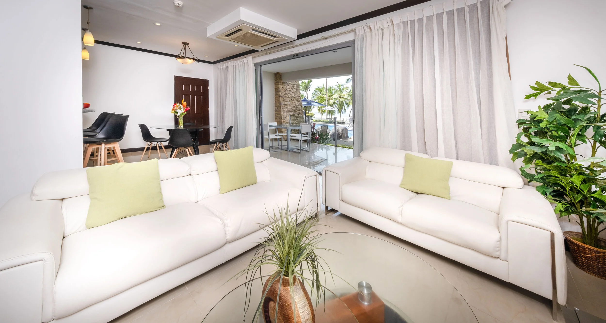 Luxurious Living Room with comfortable sofas, large flat screen TV and dining tables